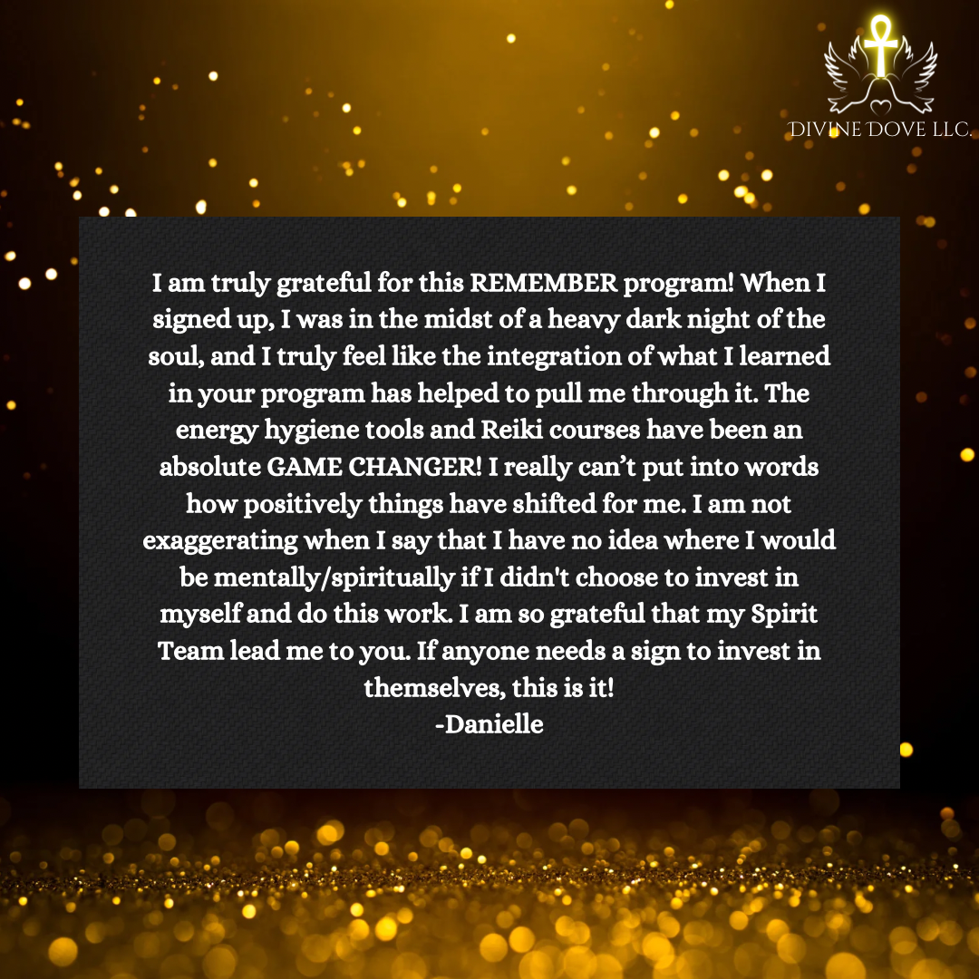 If you desire to deepen the connection to your Spirit Team & develop your spiritual gifts while being provided the energetic tools for clarity, protection & cleansing, REMEMBER is the ideal program for you.Â